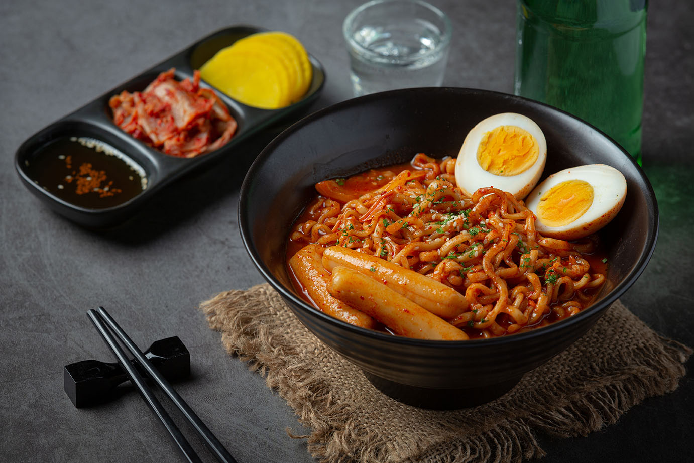 Mì Chinnoo, bò, cá viên, xúc xích, nấm kim châm, kim chi, bắp cải tím, bông cải xanh.